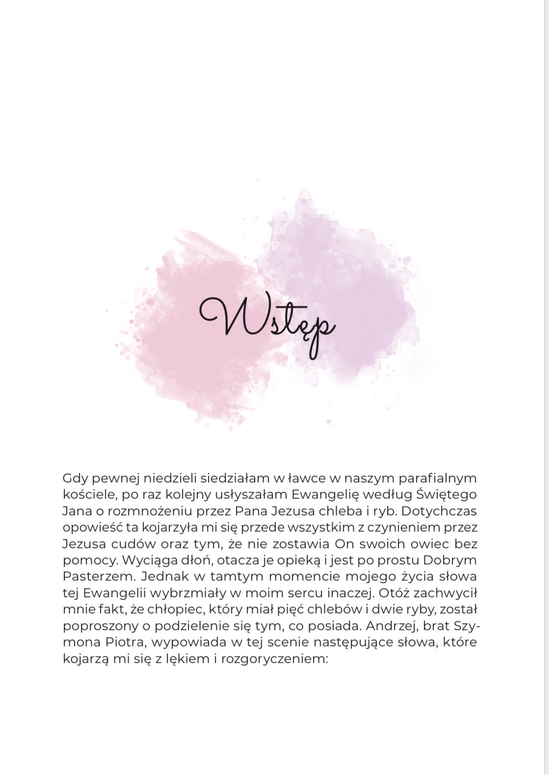Usłyszana w kościele ewangelia o pomnożeniu przez Pana Jezusa chleba i ryb poruszyła mnie bardzo gdy nadszedł na to odpowiedni czas. Chciałabym, żeby ta książka dała Wam poczucie otulenia, ale też pokazała, że z Bożą łaską i Bożym natchnieniem warto jest współpracować.