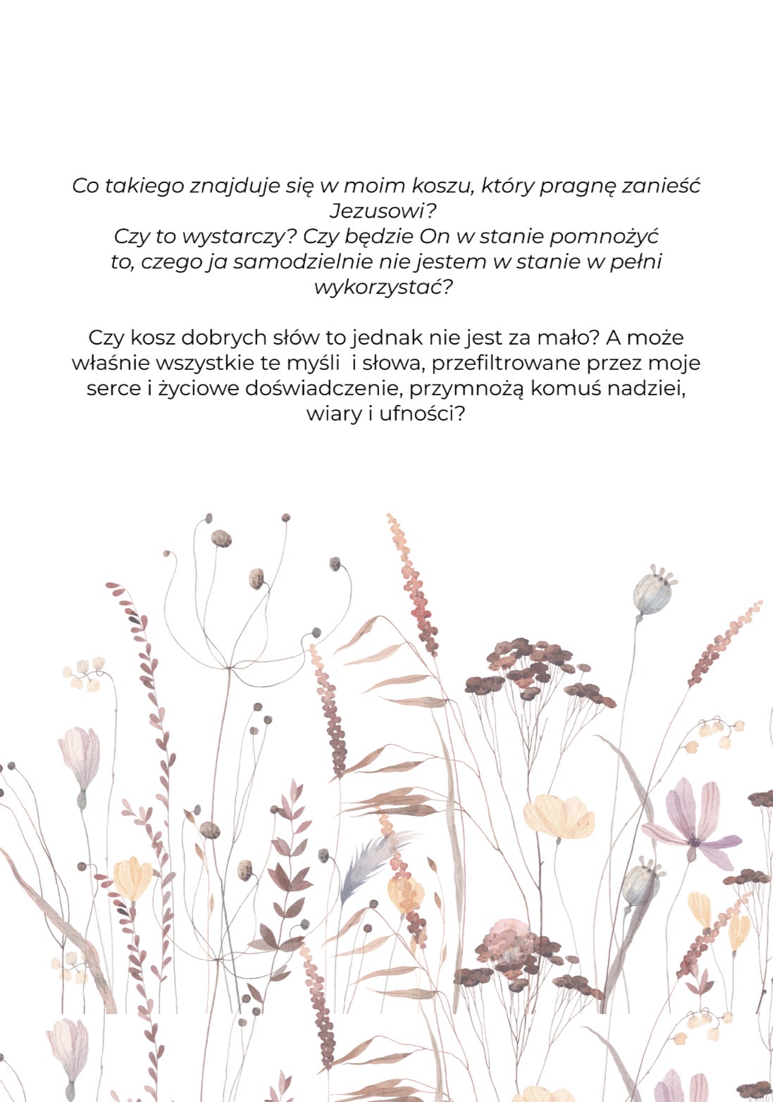 „Kosz dobrych słów” to autorski e-book, który powstał z potrzeby serca. To zbiór moich przemyśleń, refleksji i dobrych myśli, którymi chcę się z Wami podzielić. Stworzyłam go, aby przekazać wartościową treść, inspirację i odrobinę serca zamkniętą w słowach.