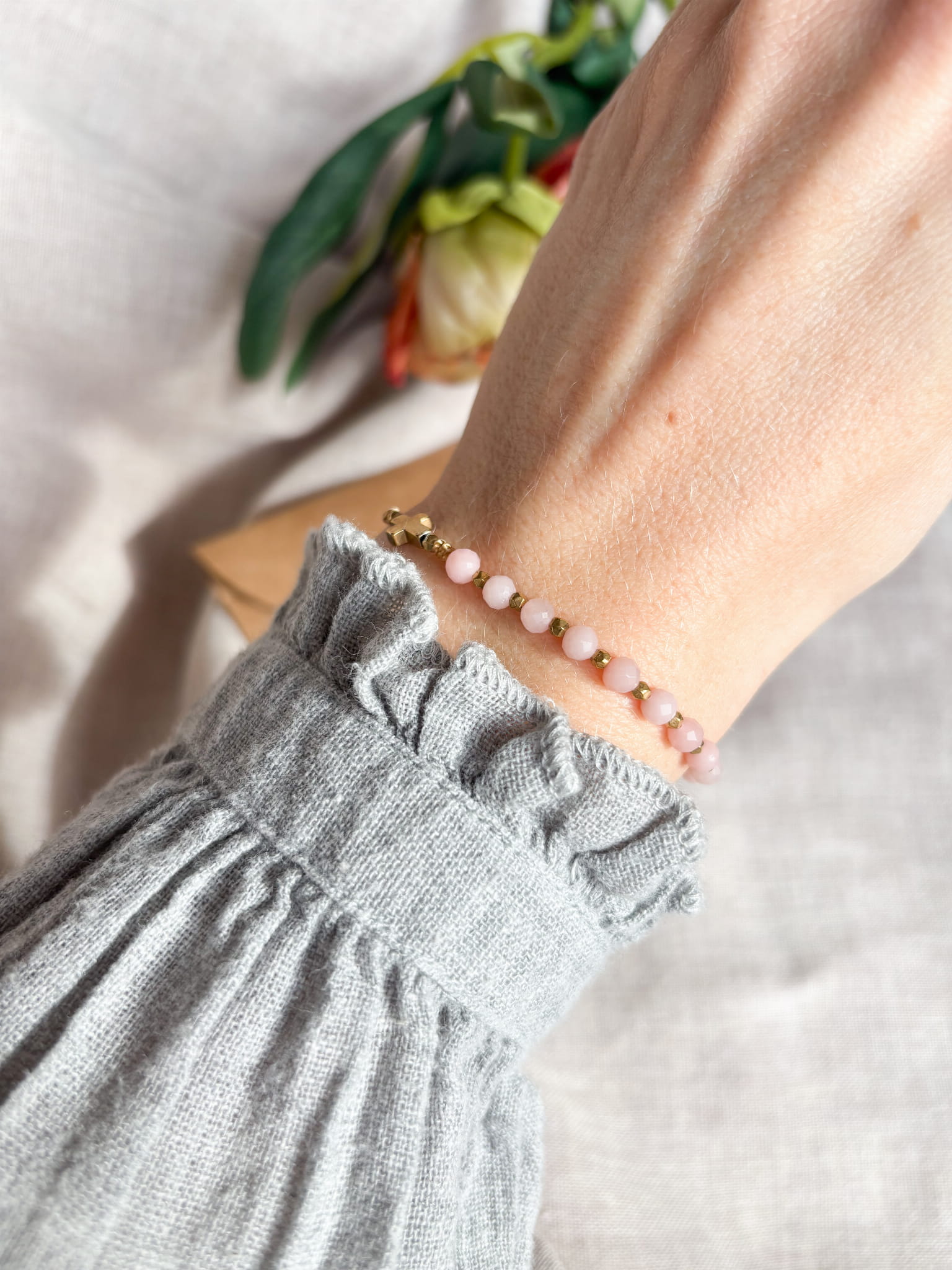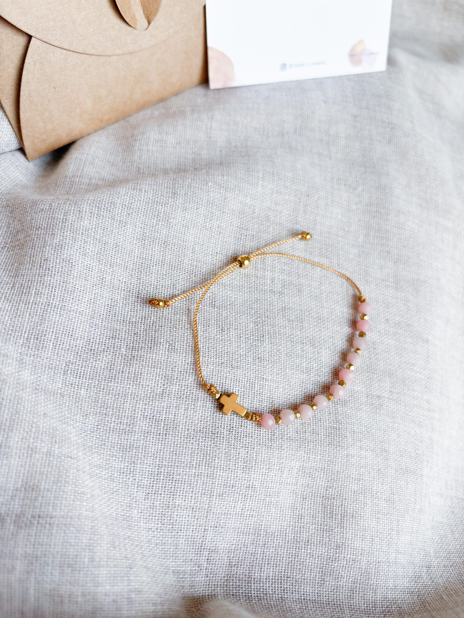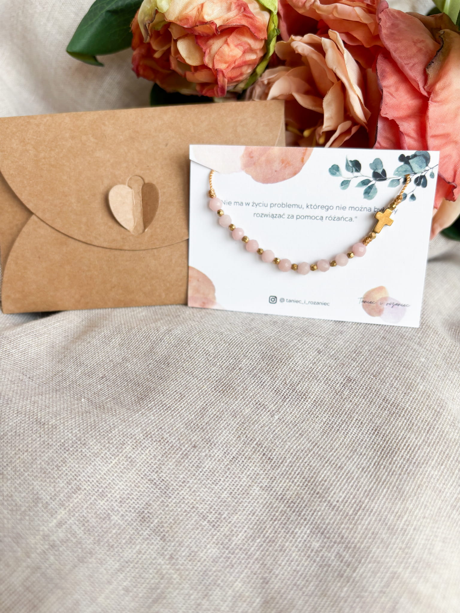Ręcznie robiony różaniec w formie bransoletki. Niech w zabieganiu i pośpiechu ten mały przedmiot przypomina Ci o modlitwie i wlewa w serce pokój. Niech będzie świadectwem wiary i narzędziem modlitwy, który będzie towarzyszyć Ci w codzienności.