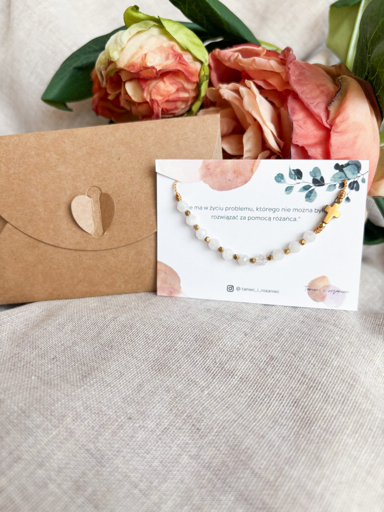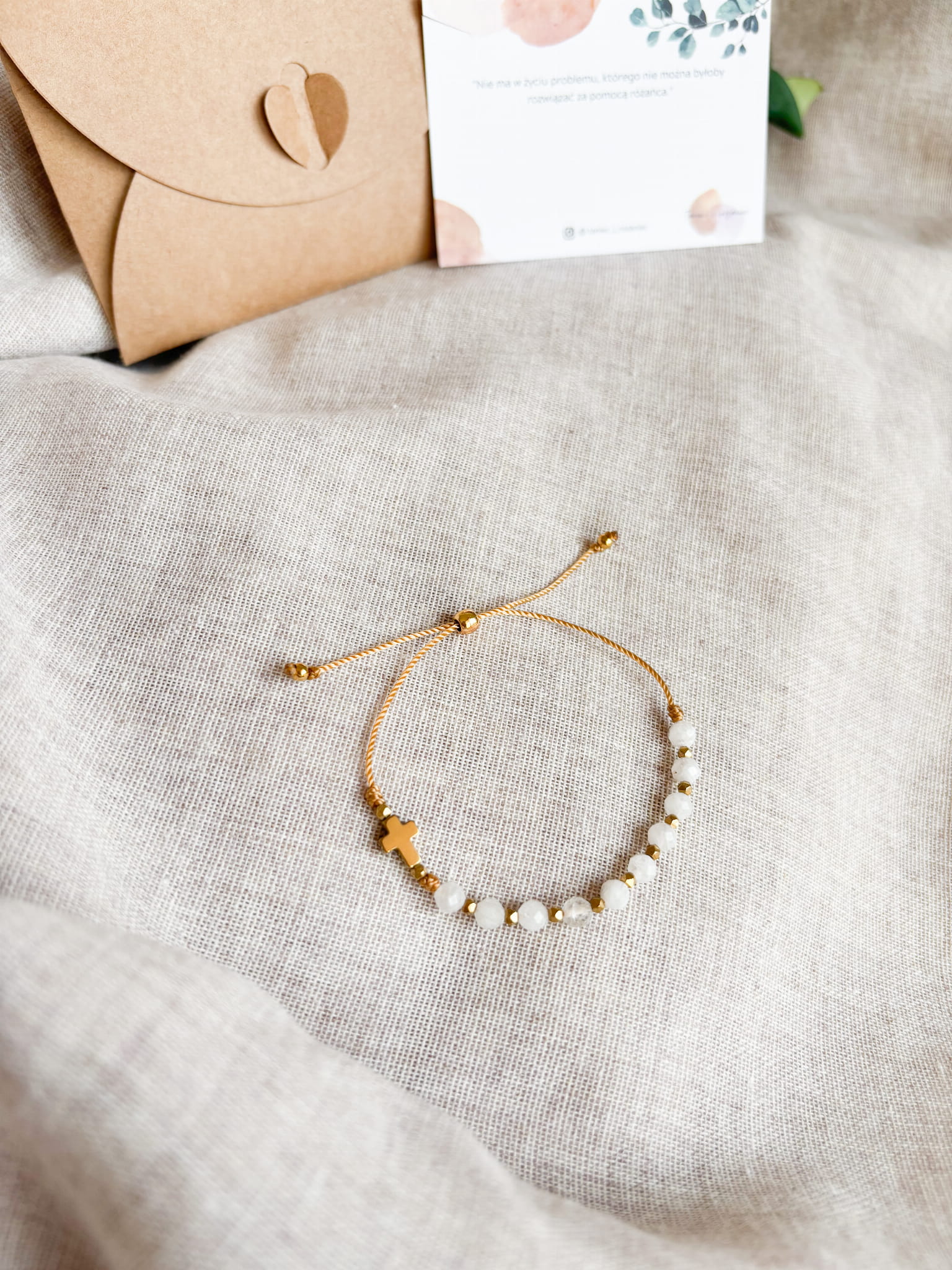 Ręcznie robiony różaniec w formie bransoletki. Niech w zabieganiu i pośpiechu ten mały przedmiot przypomina Ci o modlitwie i wlewa w serce pokój. Niech będzie świadectwem wiary i narzędziem modlitwy, który będzie towarzyszyć Ci w codzienności.