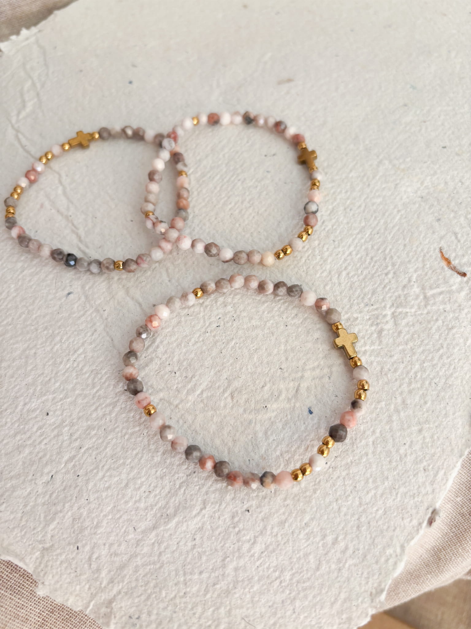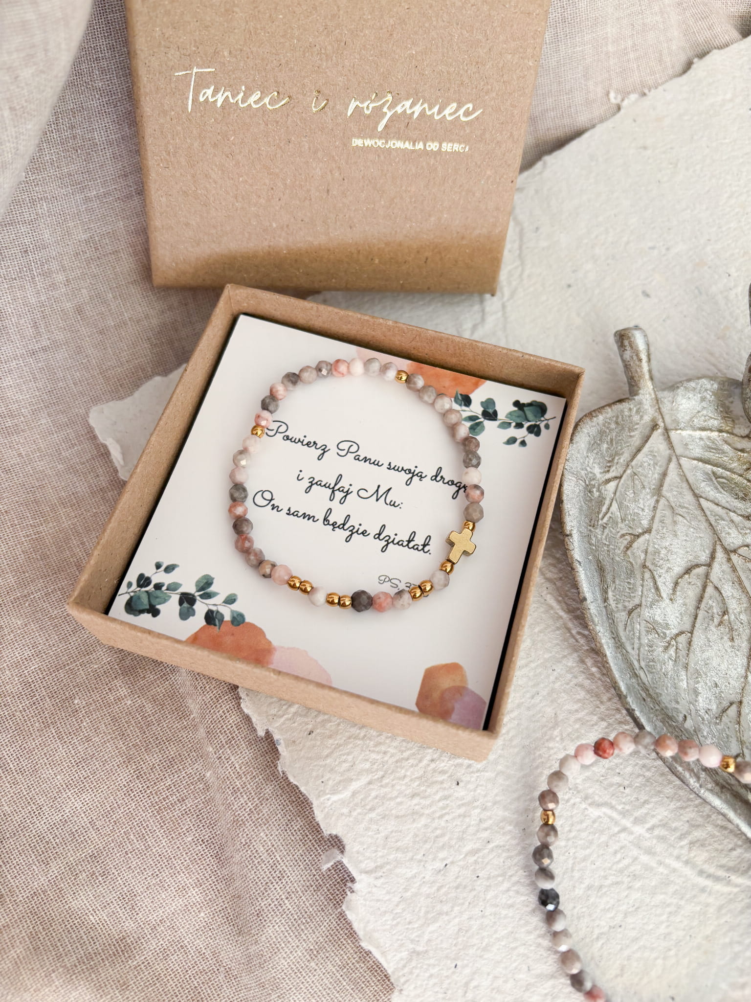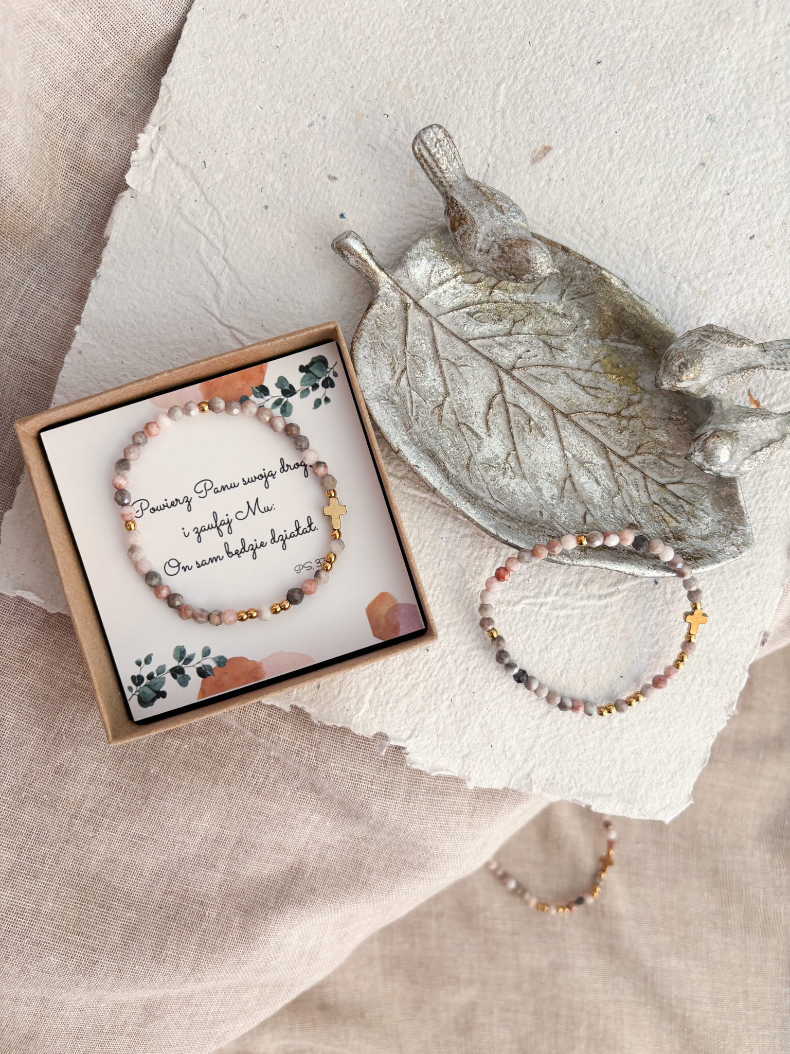 Ręcznie robiony różaniec w formie bransoletki. Niech w zabieganiu i pośpiechu ten mały przedmiot przypomina Ci o modlitwie i wlewa w serce pokój. Niech będzie świadectwem wiary i narzędziem modlitwy, który będzie towarzyszyć Ci w codzienności.