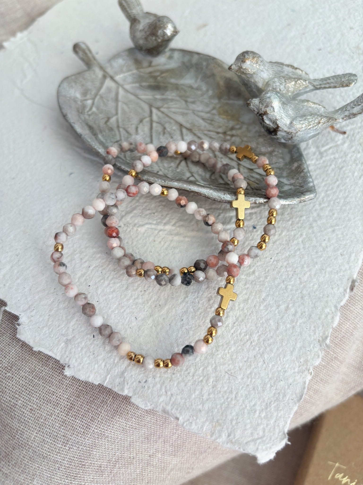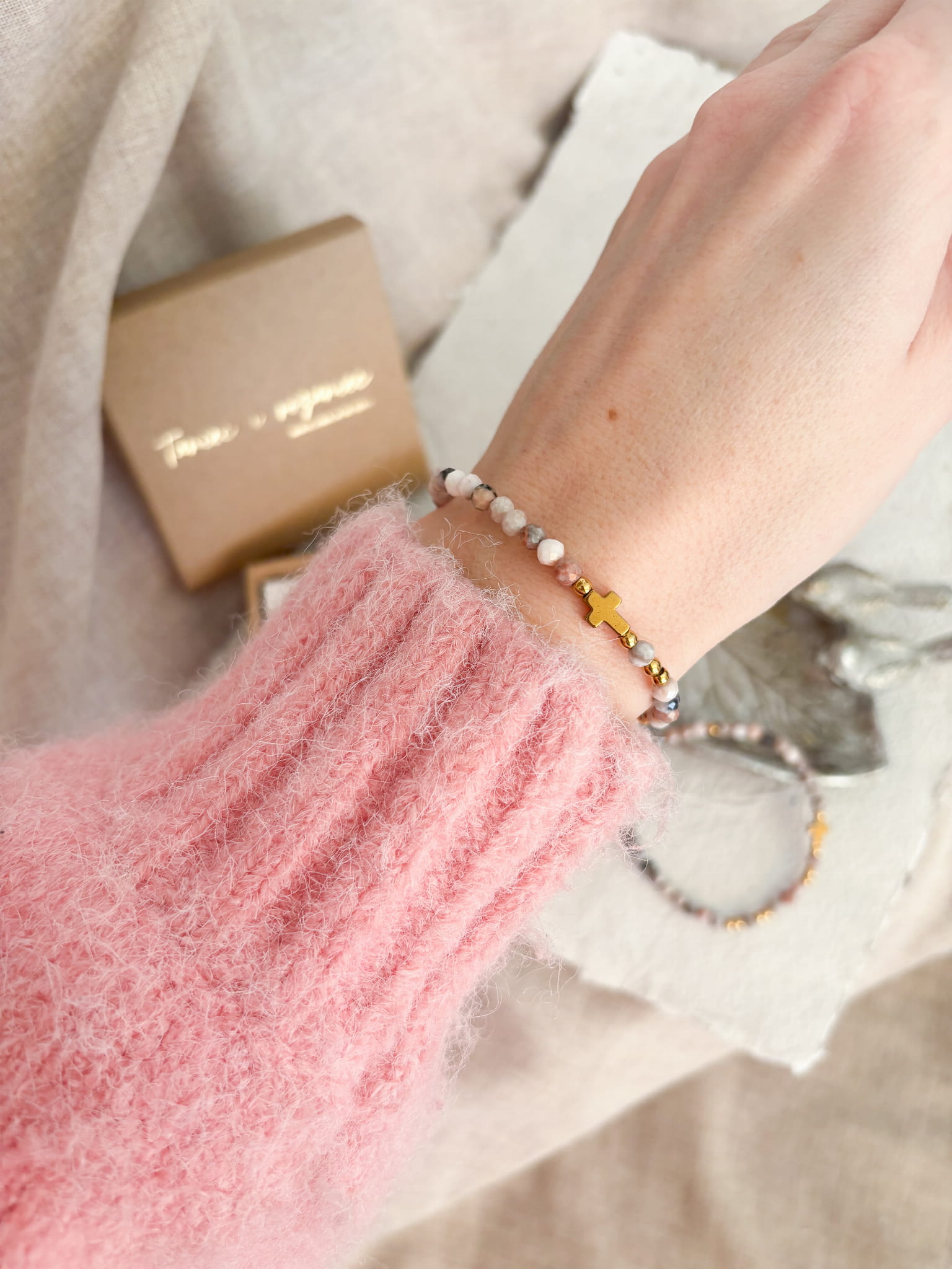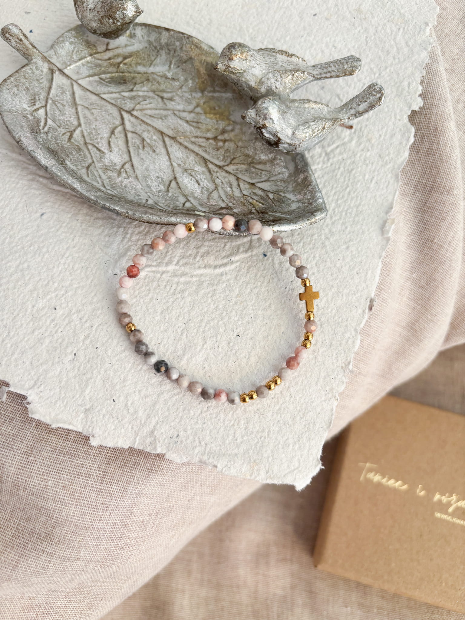 Ręcznie robiony różaniec w formie bransoletki. Niech w zabieganiu i pośpiechu ten mały przedmiot przypomina Ci o modlitwie i wlewa w serce pokój. Niech będzie świadectwem wiary i narzędziem modlitwy, który będzie towarzyszyć Ci w codzienności.